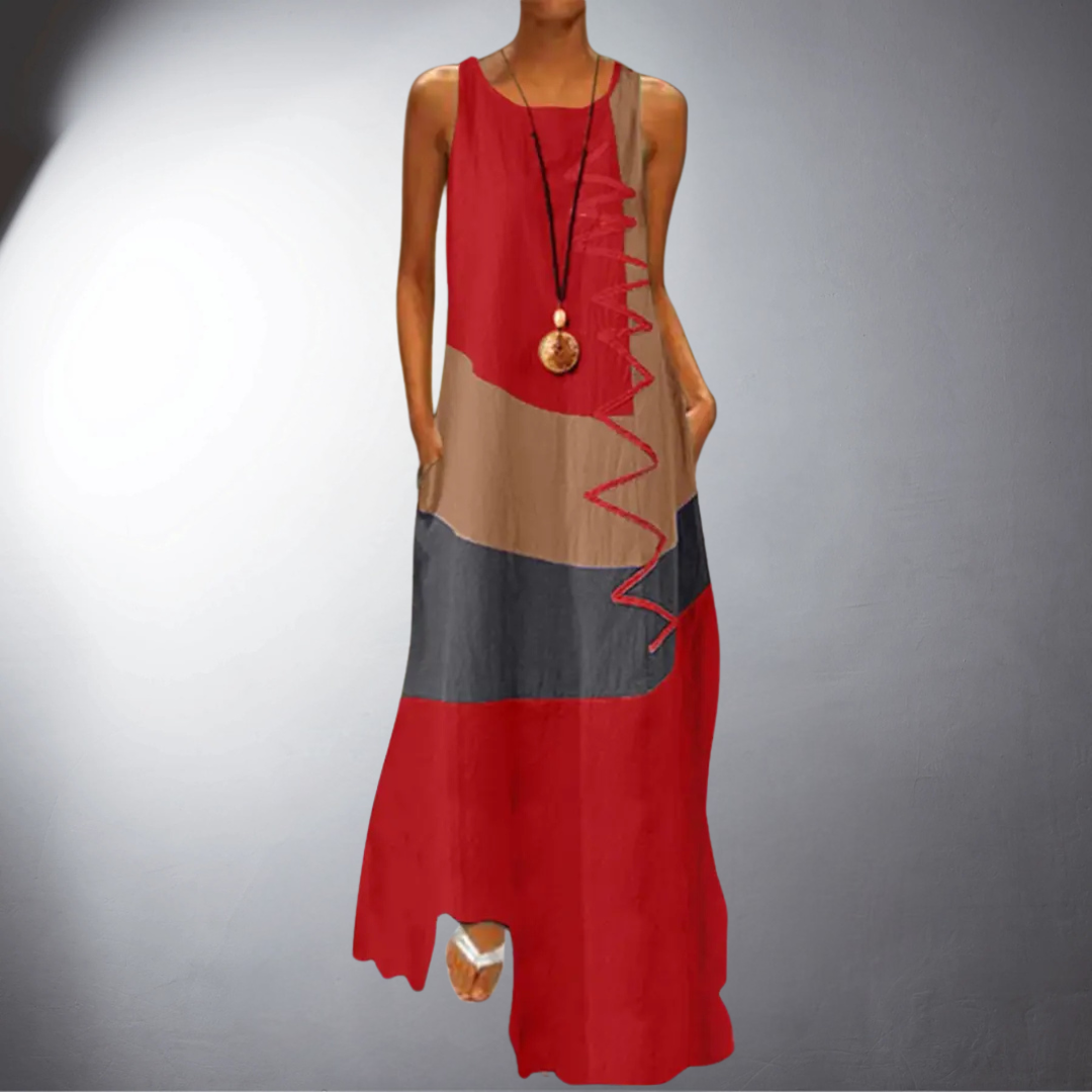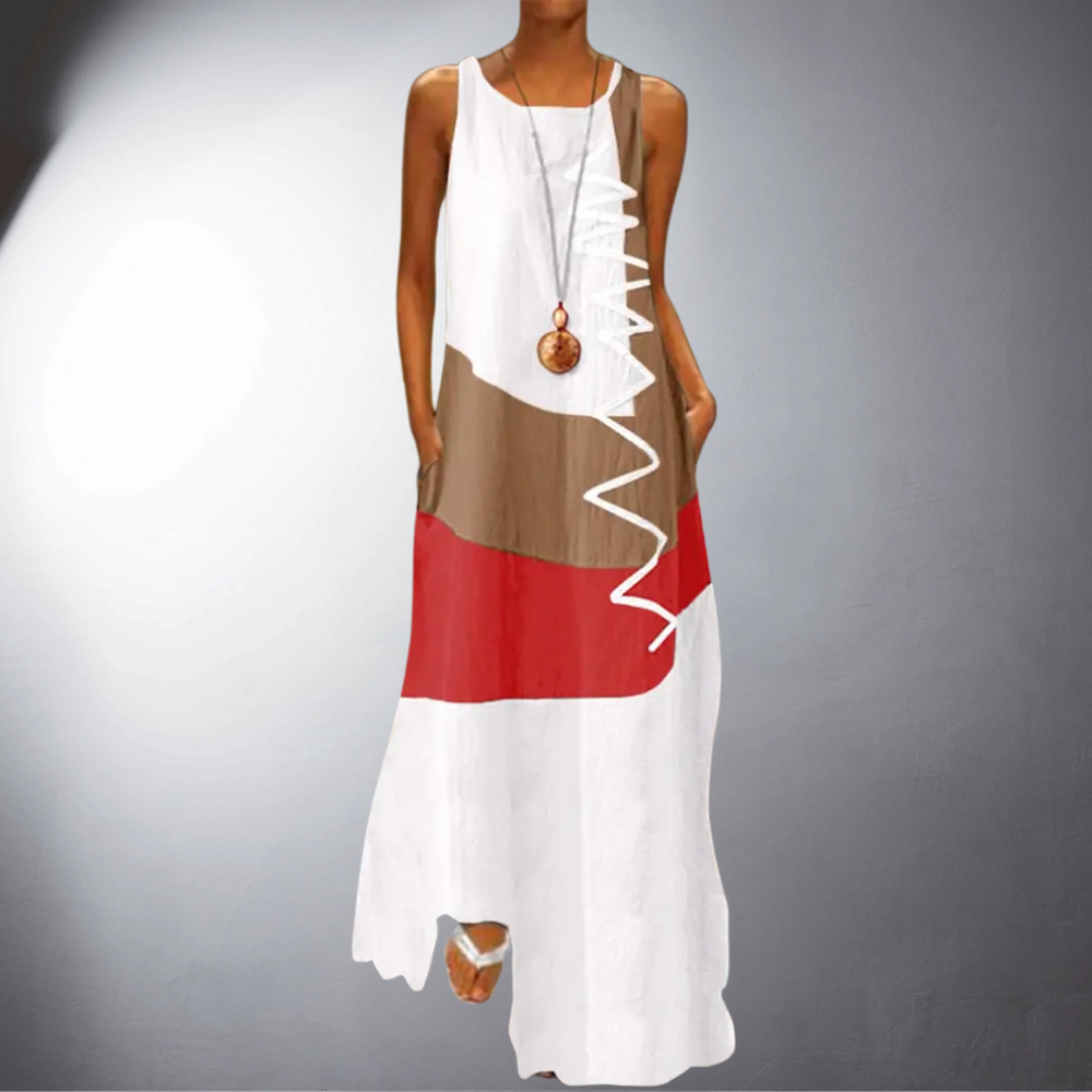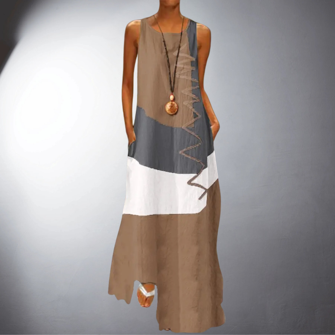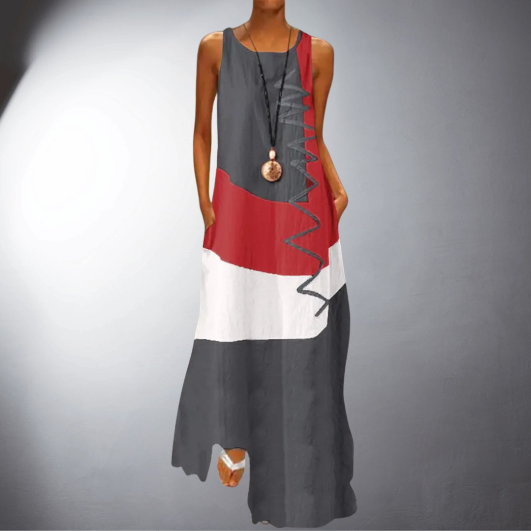 Il nostro best-seller è un abito lungo senza maniche dal design raffinato e rilassato. Realizzato in morbido cotone premium, offre una vestibilità ampia e fluida, perfetta per ogni occasione. Il motivo a blocchi di colore con righe e tasche aggiunge un tocco moderno e pratico, rendendolo un capo essenziale nel tuo guardaroba.