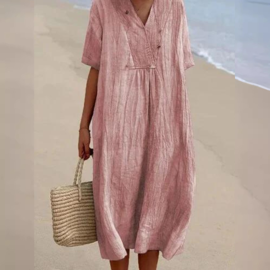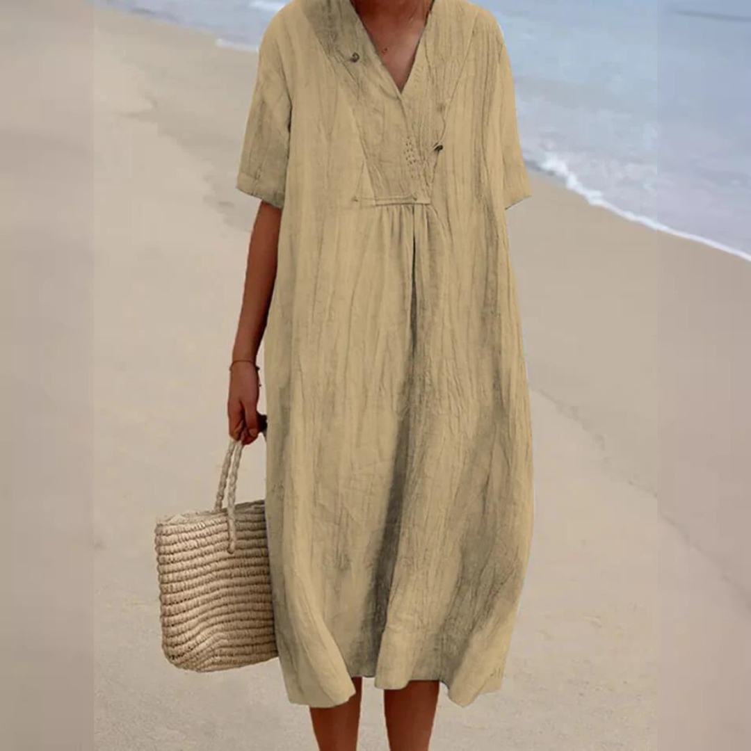 L'abito estivo che unisce comodità e stile. La vestibilità generosa e le maniche corte offrono il massimo comfort, mentre il look casual-chic è sempre di tendenza.